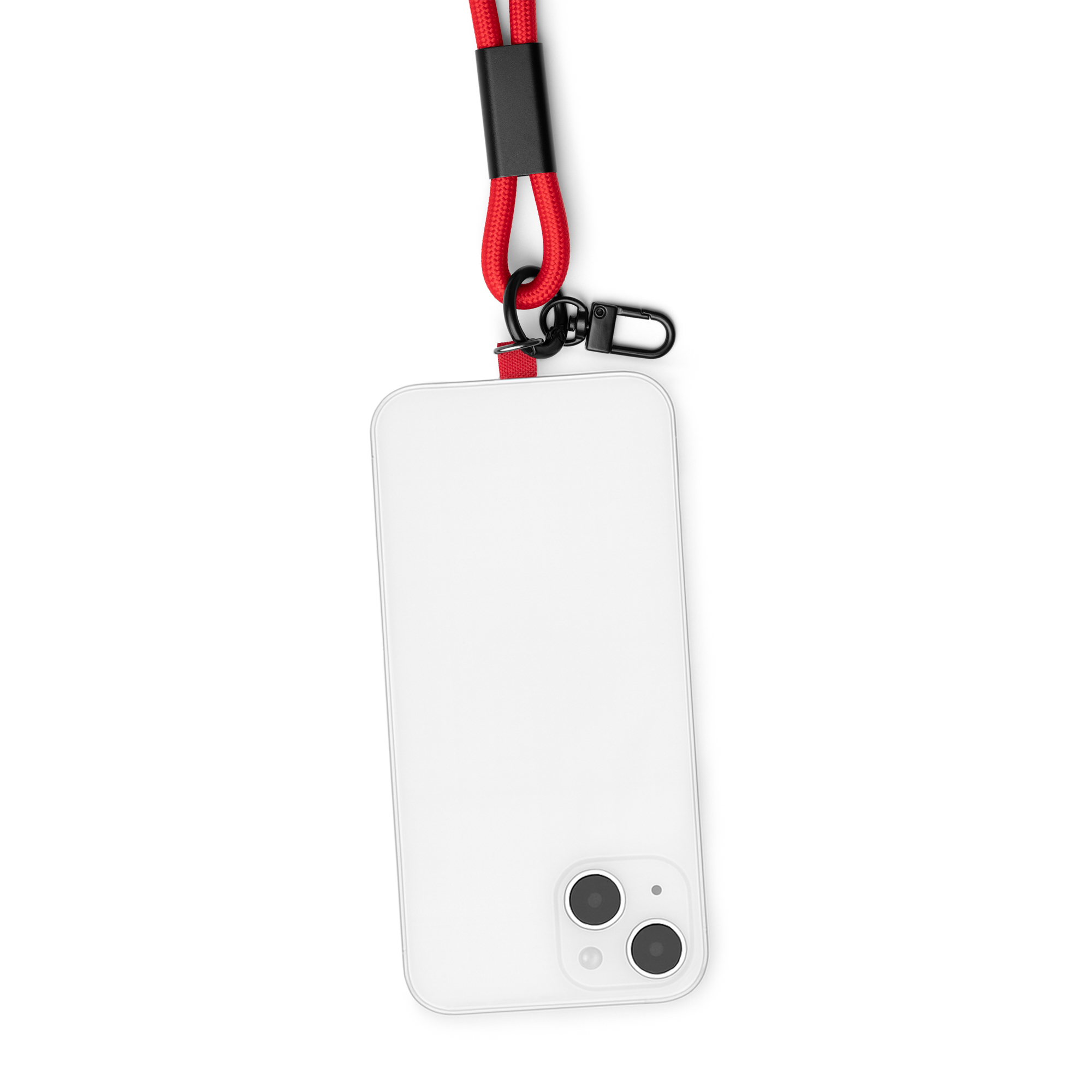 Landyard elaborado en nylon reciclado con función soporte para smartphone y cable de conexión Tipo C en ambos extremo. El cable sirve tanto a modo de conexión para carga como para transferencia de datos. Cuenta con un mosquetón pequeño en su extremo para transporte de otros objetos.