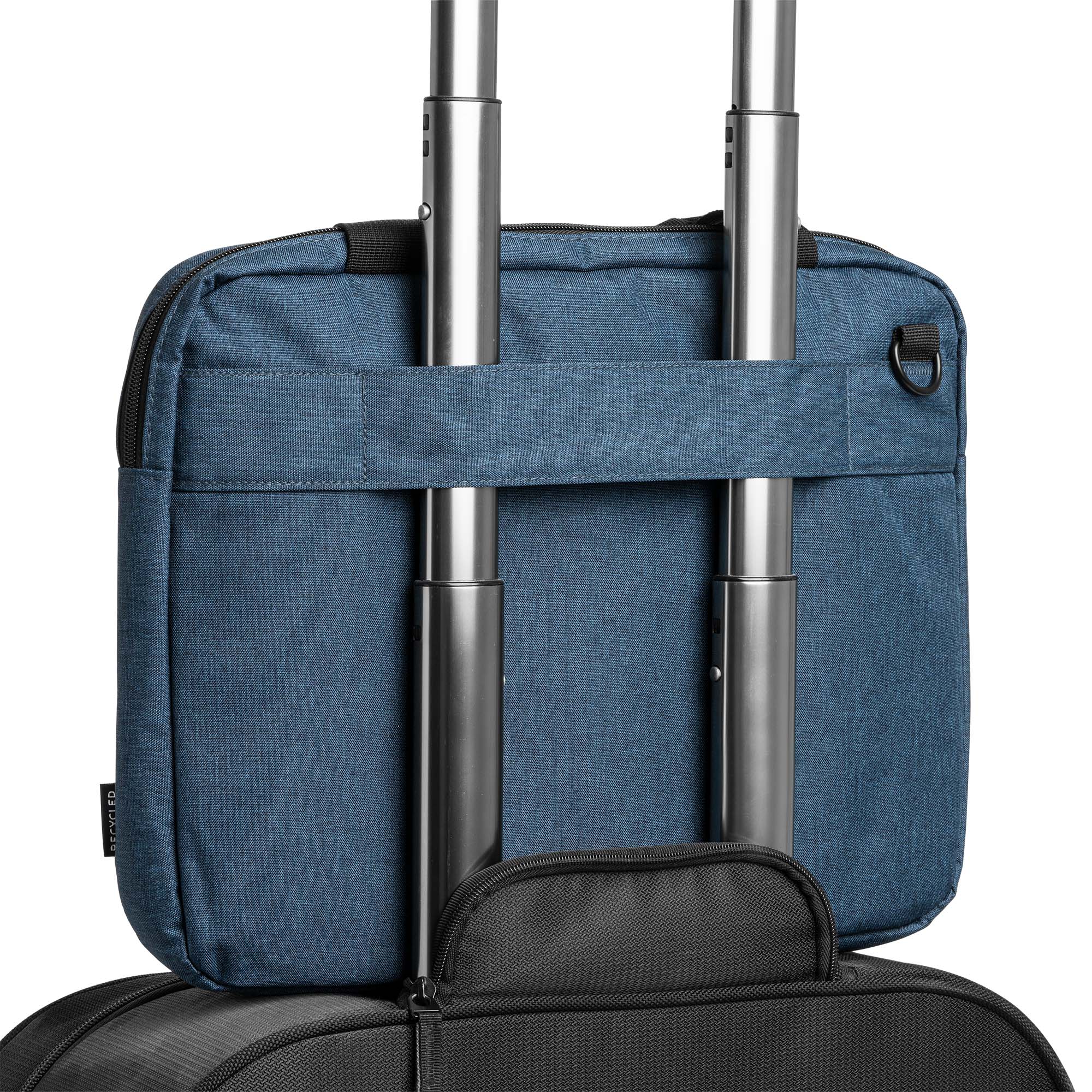 Portadocumentos acolchado para portátil realizado en poliéster reciclado RPET 600D con diseño vigoré. Cuenta con dos compartimentos con cremallera impermeable, asas de transporte y cinta bandolera ajustable a juego. Incluye cinta para trolley.
