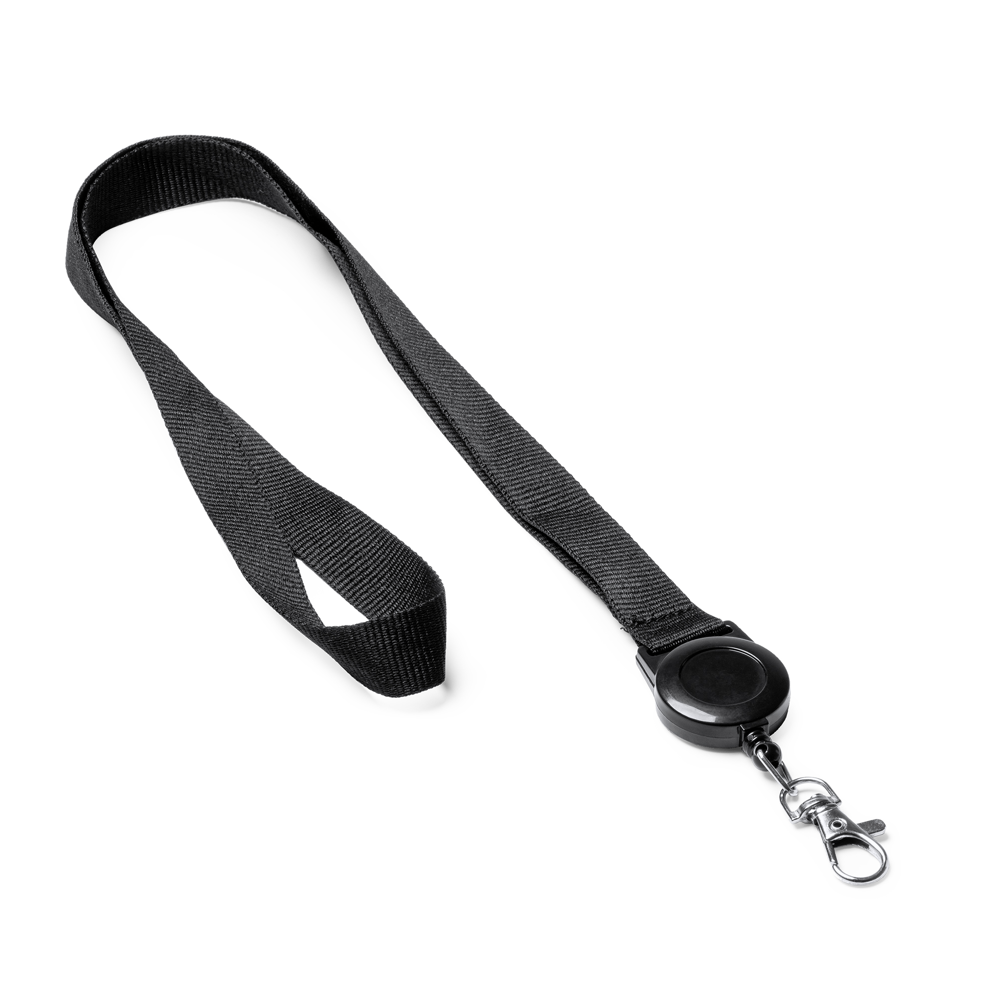 Lanyard con accesorio retráctil extensible. Incluye mosquetón.